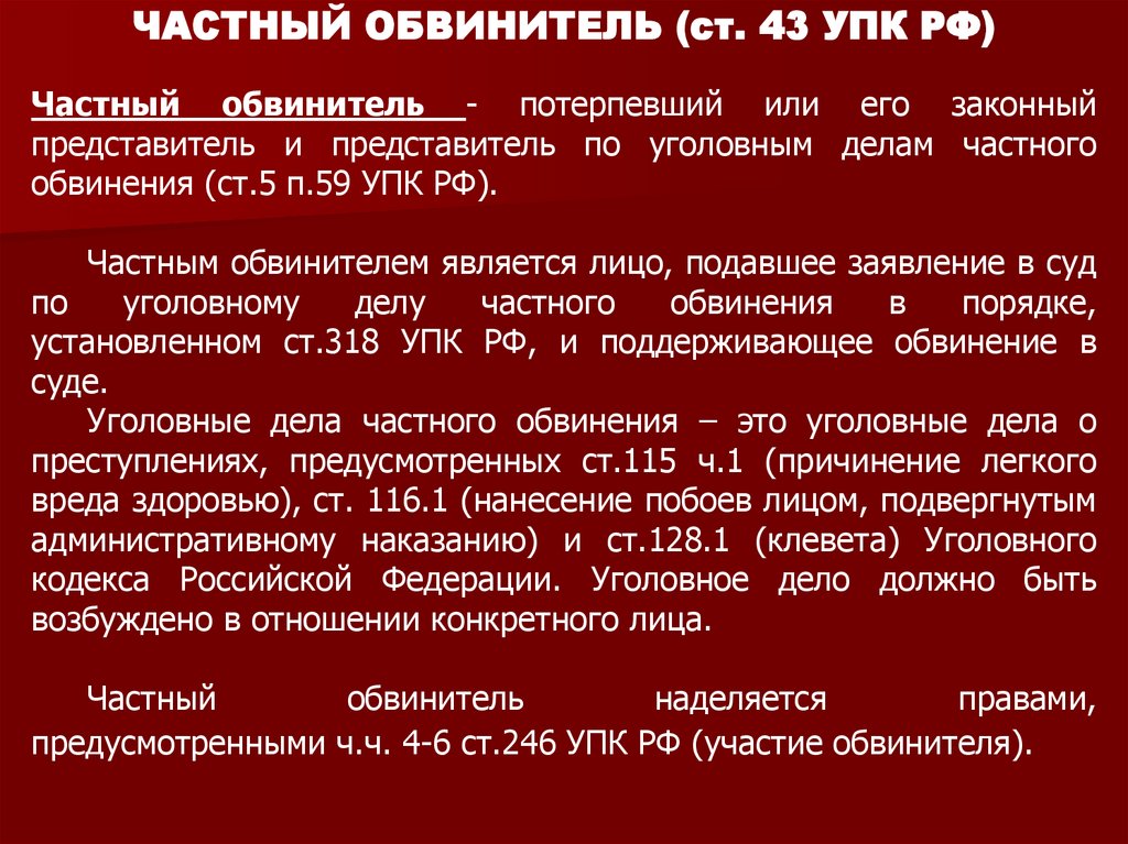 ЧАСТНЫЙ ОБВИНИТЕЛЬ (ст. 43 УПК РФ)Частный обвинитель - потерпевший или его законный