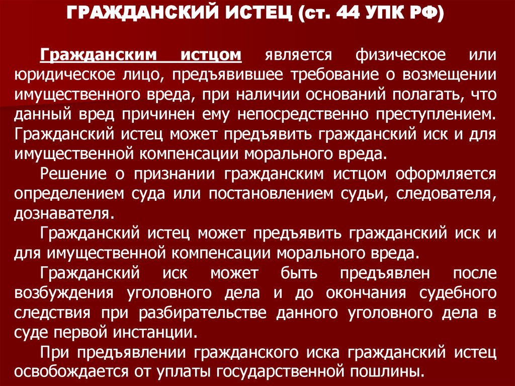 ГРАЖДАНСКИЙ ИСТЕЦ (ст. 44 УПК РФ)Гражданским истцом является физическое или