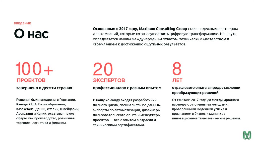 Основанная в 2017 году, Maxinum Consulting Group стала надежным партнеромдля компаний, которые хотят осуществить цифровую трансформацию. Наш путь