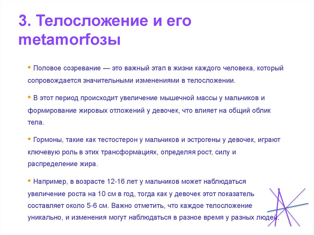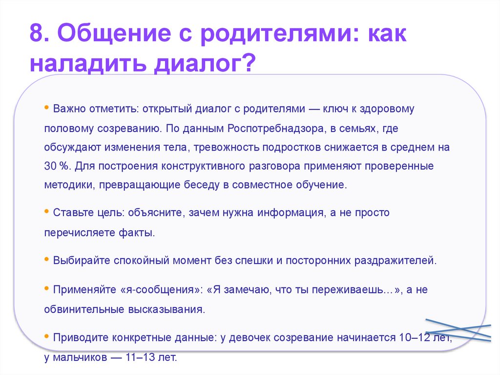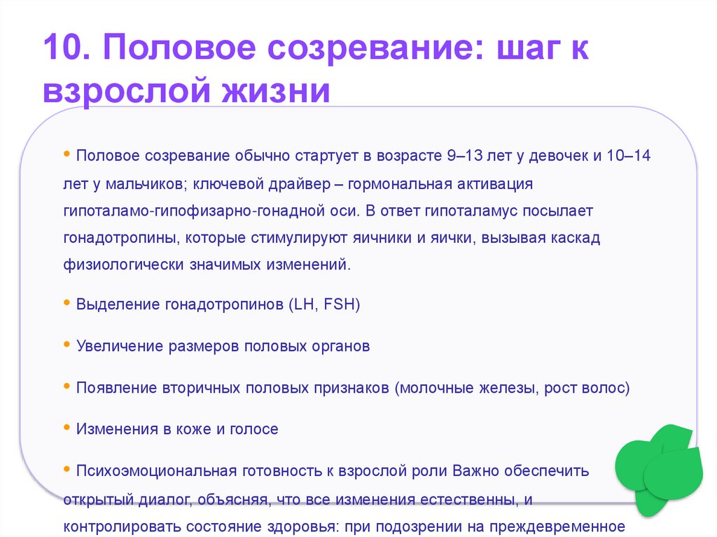 • Приводите конкретные данные: у девочек созревание начинается 10–12 лет,