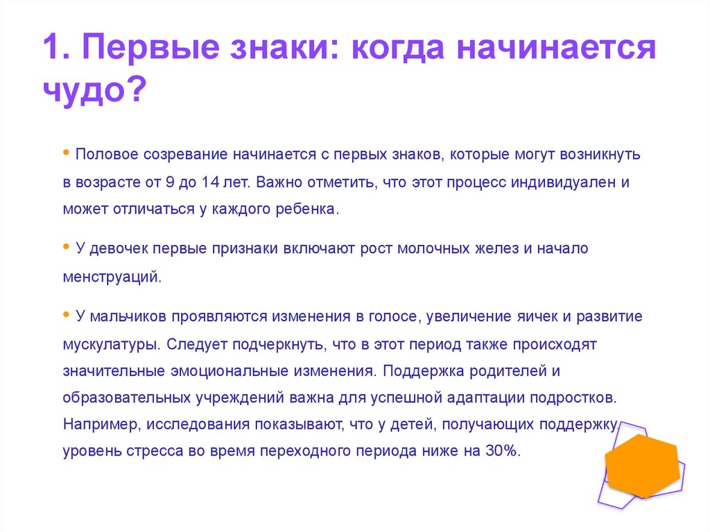 • Половое созревание начинается с первых знаков, которые могут возникнуть