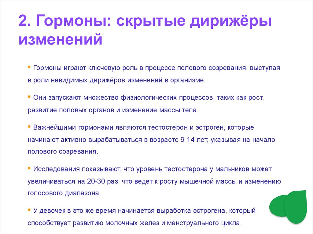 • Гормоны играют ключевую роль в процессе полового созревания, выступая