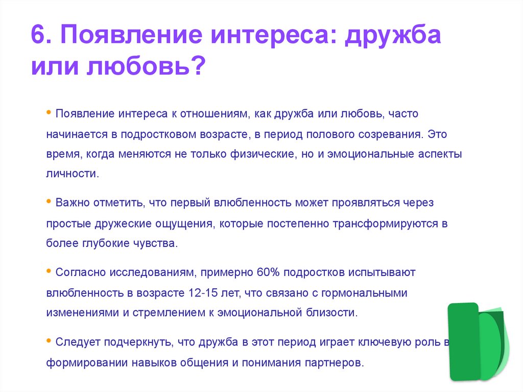 • Появление интереса к отношениям, как дружба или любовь, часто