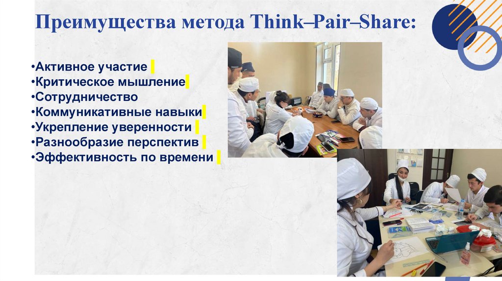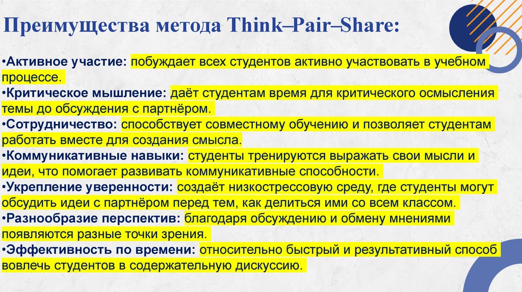 Преимущества метода Think–Pair–Share:•Активное участие: побуждает всех студентов активно участвовать в учебном