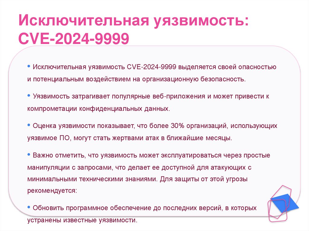 • Исключительная уязвимость CVE-2024-9999 выделяется своей опасностью
