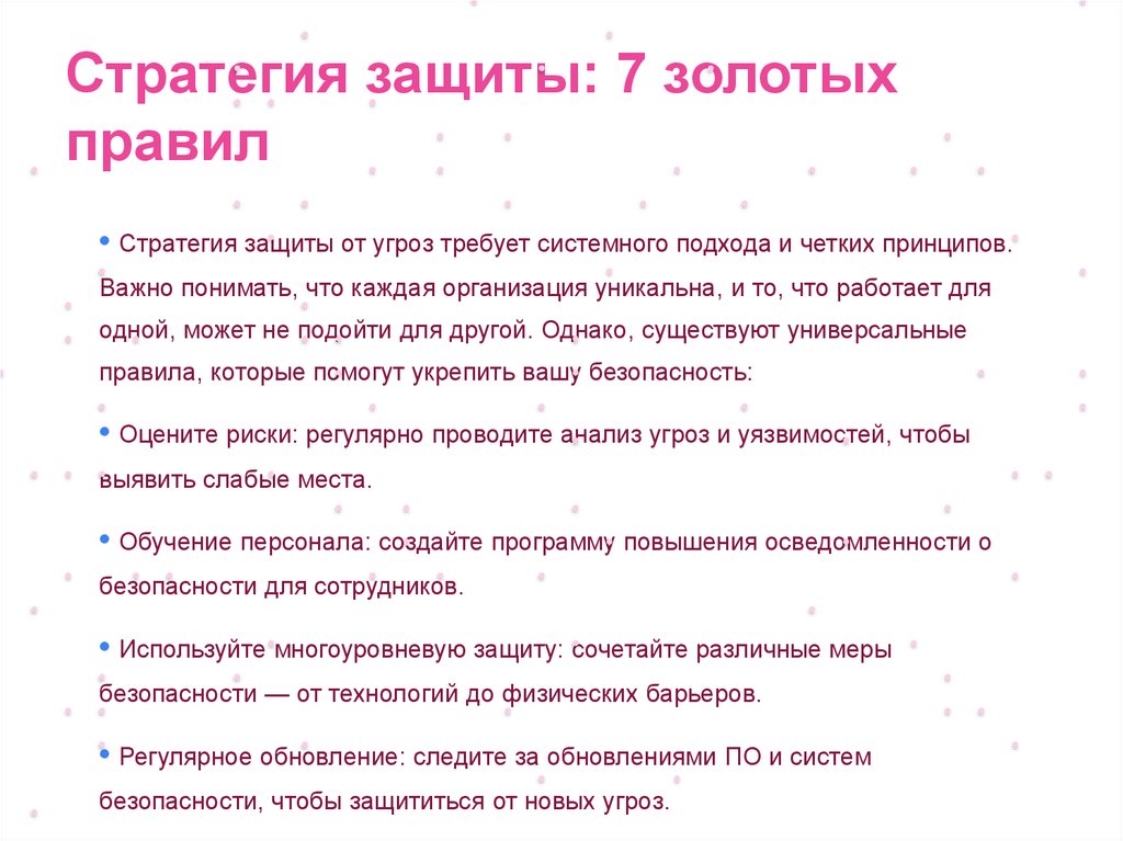 • Стратегия защиты от угроз требует системного подхода и четких принципов.