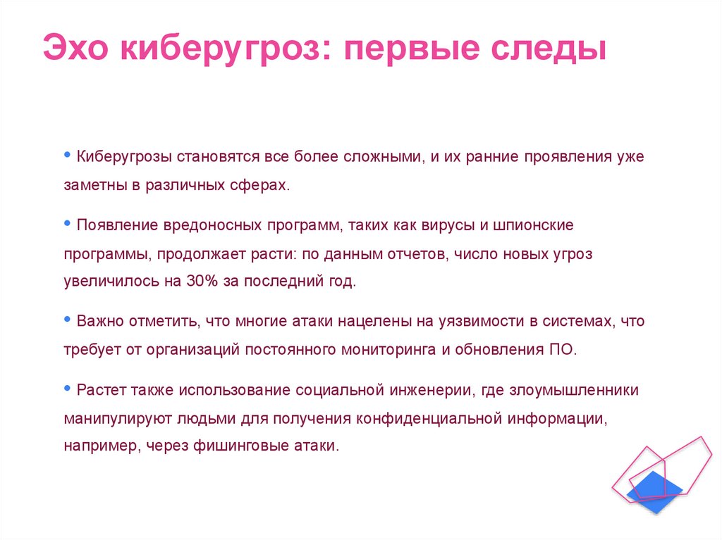 Эхо киберугроз: первые следы• Киберугрозы становятся все более сложными, и их ранние проявления уже