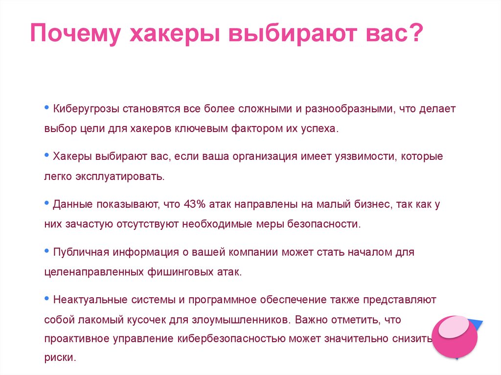 Почему хакеры выбирают вас?• Киберугрозы становятся все более сложными и разнообразными, что делает