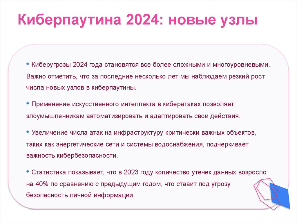 Киберпаутина 2024: новые узлы• Киберугрозы 2024 года становятся все более сложными и многоуровневыми.
