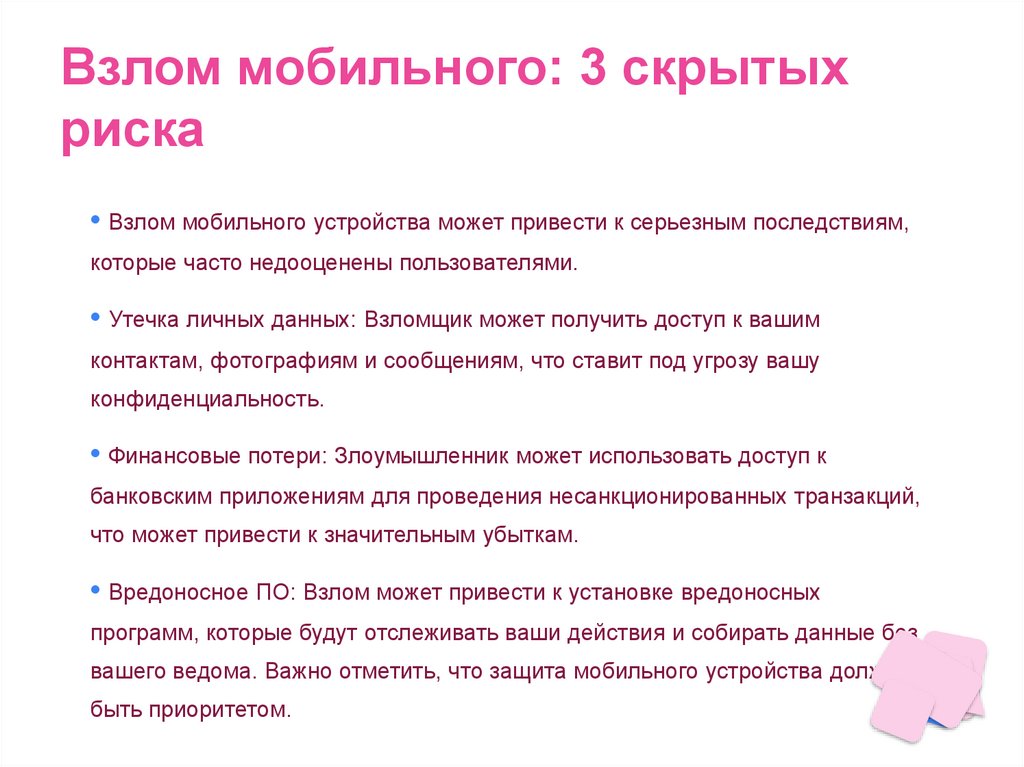 • Взлом мобильного устройства может привести к серьезным последствиям,