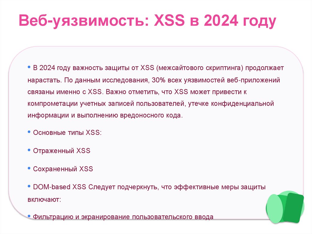 • XSS (межсайтовый скриптинг): Позволяет атакующим внедрять скрипты на