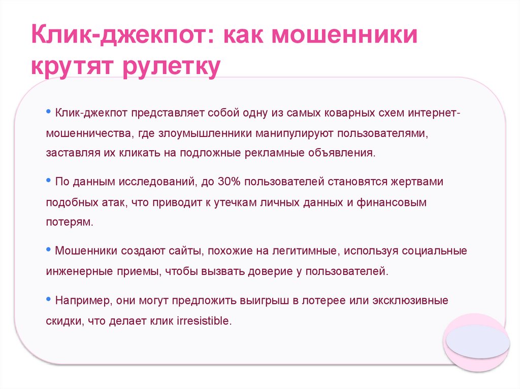 • Клик-джекпот представляет собой одну из самых коварных схем интернетмошенничества, где злоумышленники манипулируют пользователями,