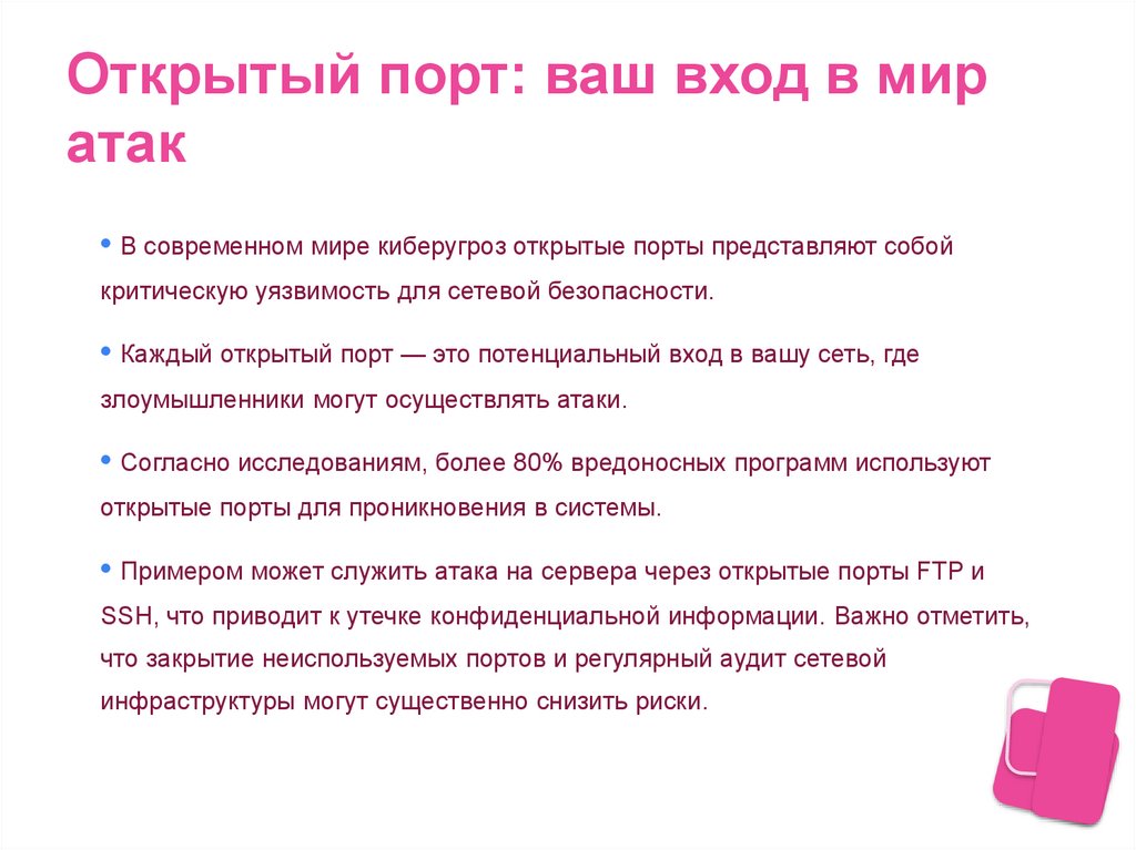 • Каждый открытый порт — это потенциальный вход в вашу сеть, где