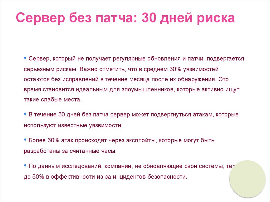 Сервер без патча: 30 дней риска• Сервер, который не получает регулярные обновления и патчи, подвергается