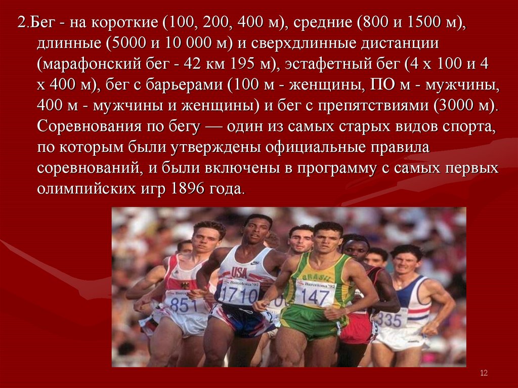 2.Бег - на короткие (100, 200, 400 м), средние (800 и 1500 м),длинные (5000 и 10 000 м) и сверхдлинные дистанции