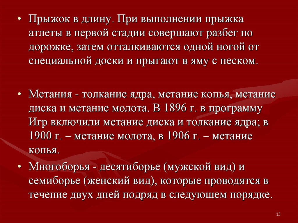 11. Виды легкой атлетики принято подразделять на пять разделов: ходьбу, бег, прыжки, метания и многоборья.
