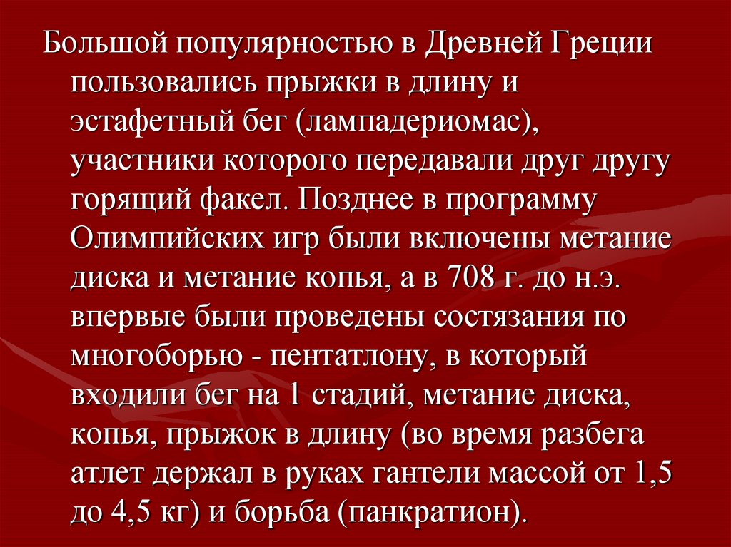 Большой популярностью в Древней Грециипользовались прыжки в длину и