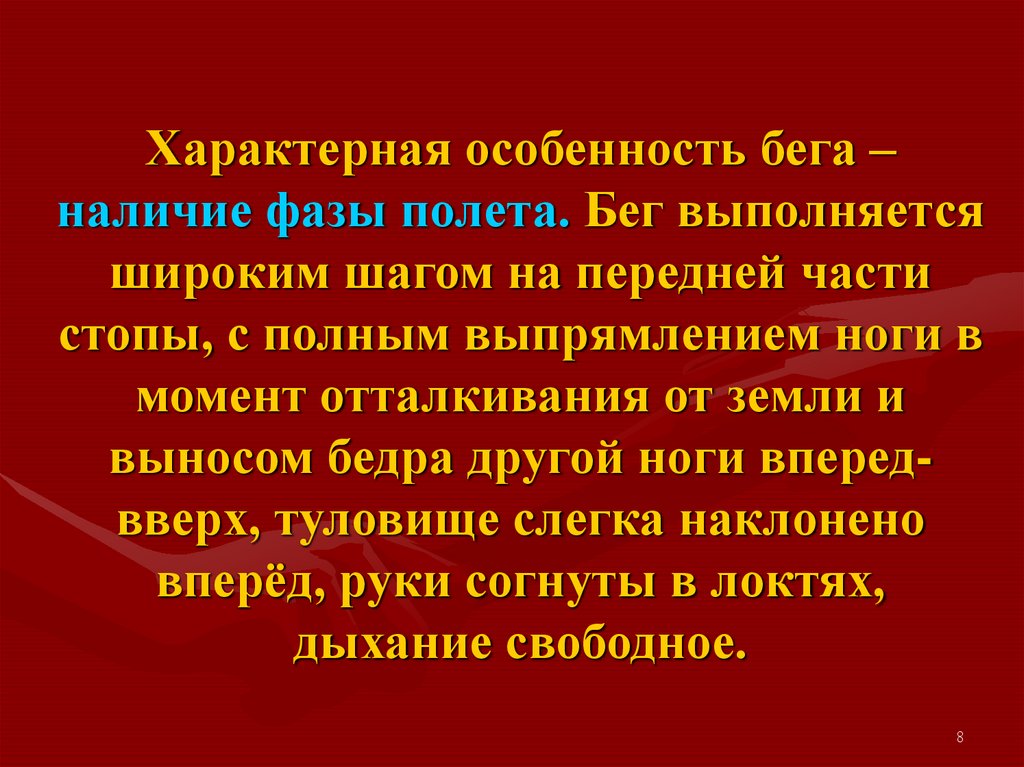 Характерная особенность бега –наличие фазы полета. Бег выполняется