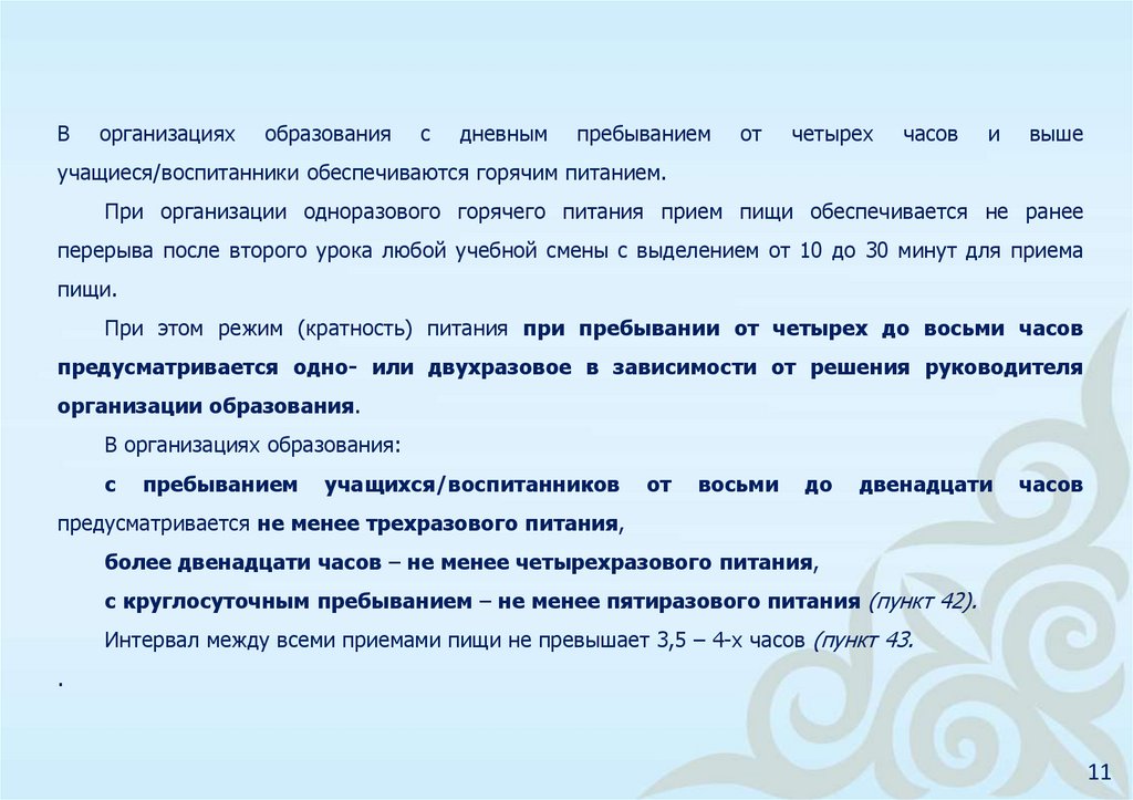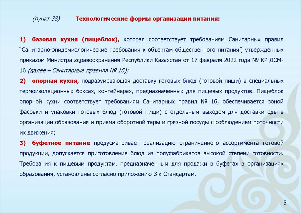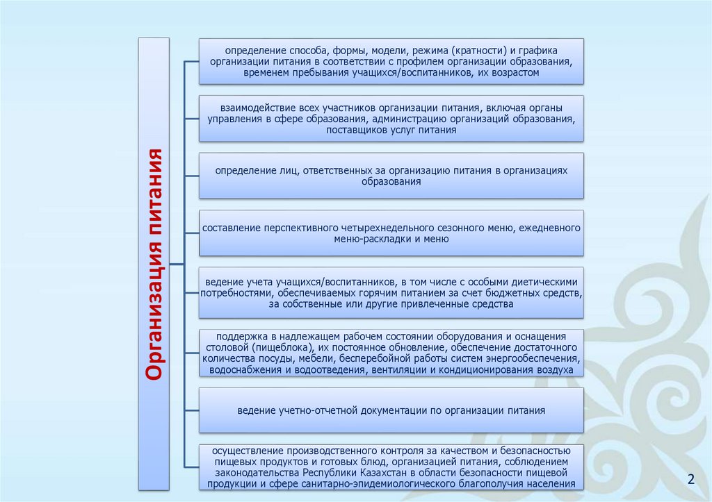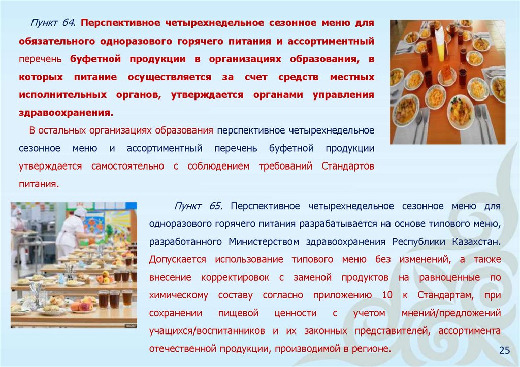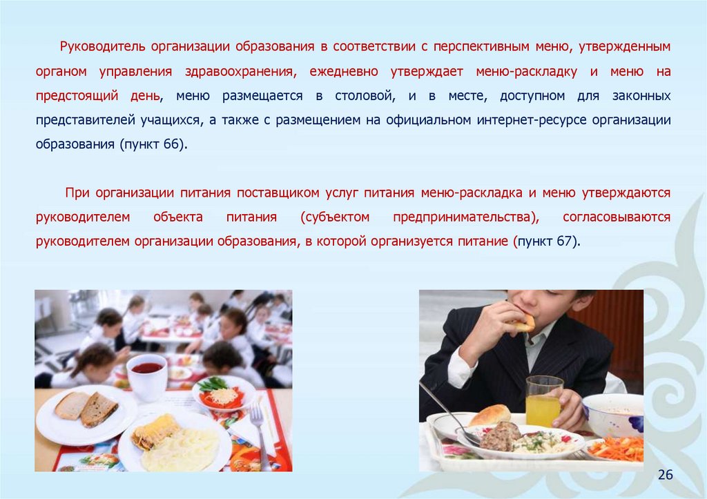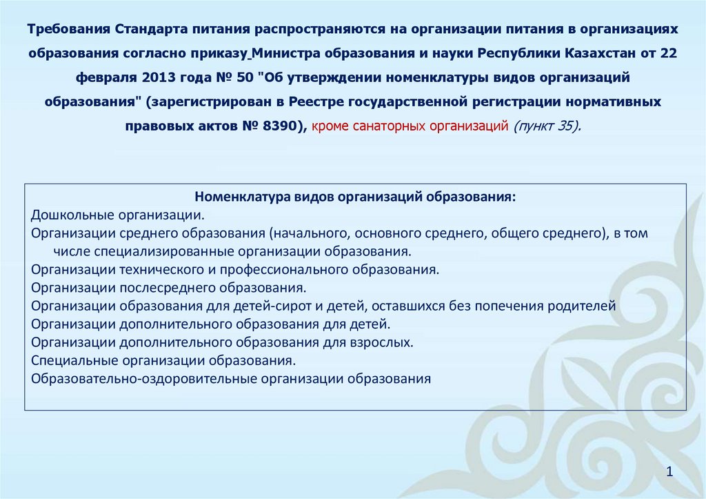 Требования Стандарта питания распространяются на организации питания в организацияхобразования согласно приказу Министра образования и науки Республики Казахстан от 22
