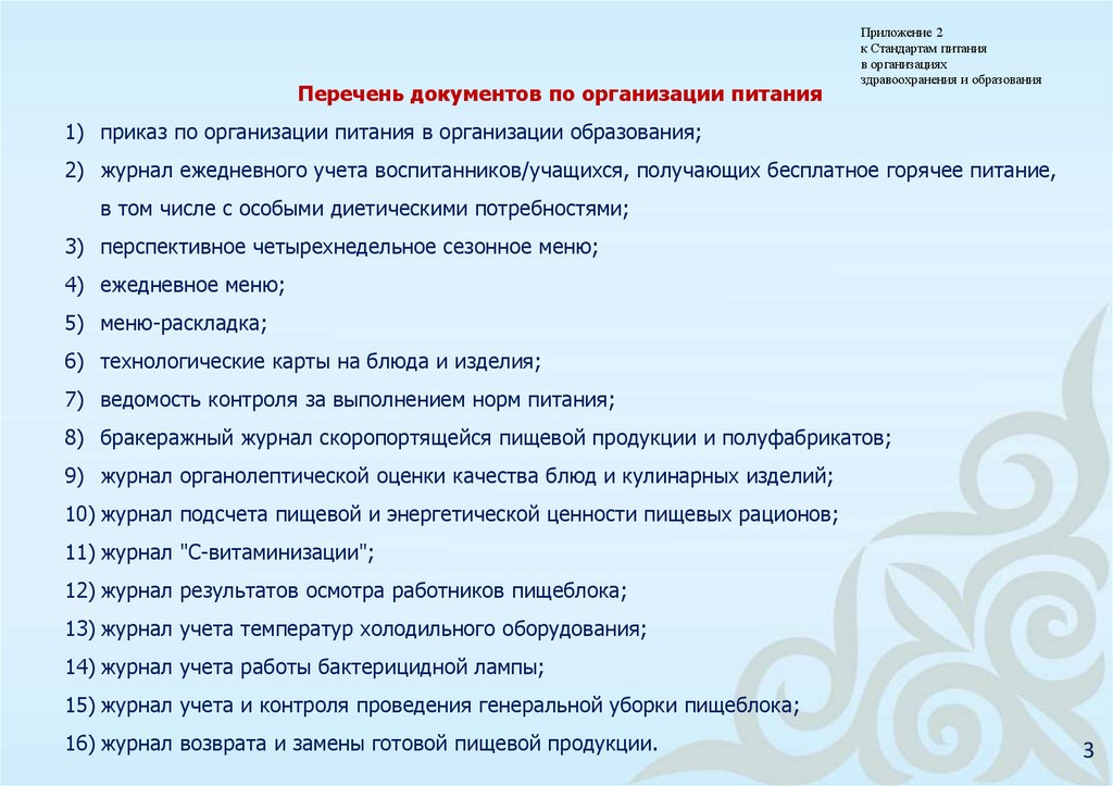 Перечень документов по организации питанияПриложение 2
