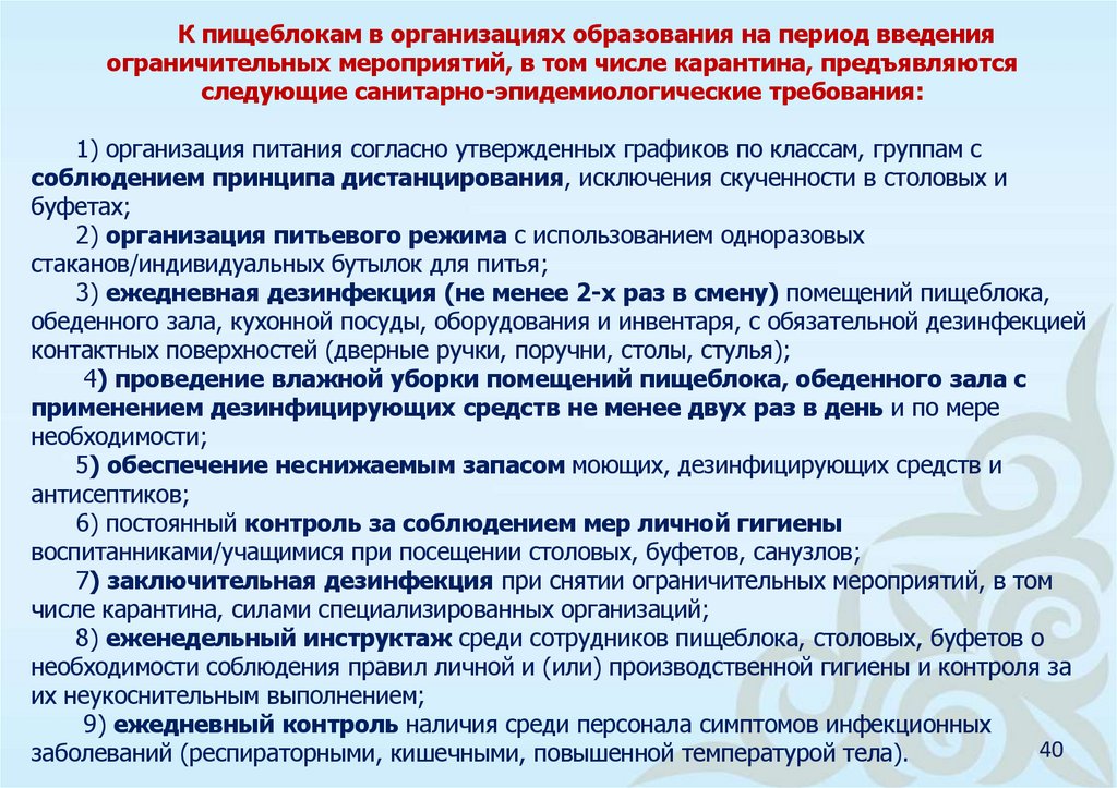 9) ежедневный контроль наличия среди персонала симптомов инфекционных