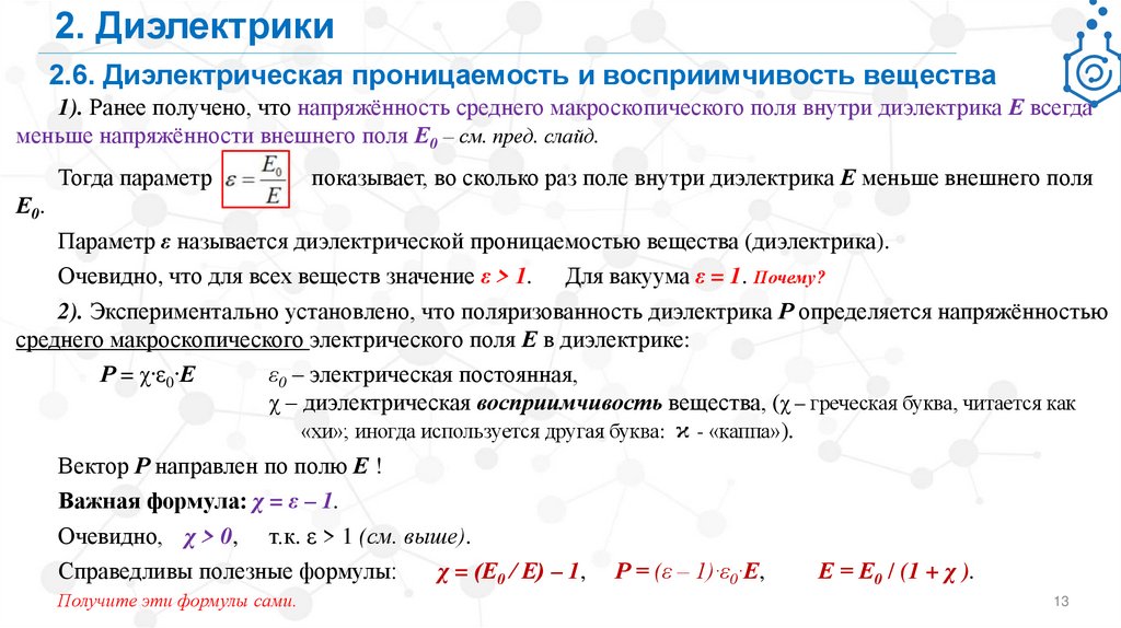 2. Диэлектрики2.6. Диэлектрическая проницаемость и восприимчивость вещества