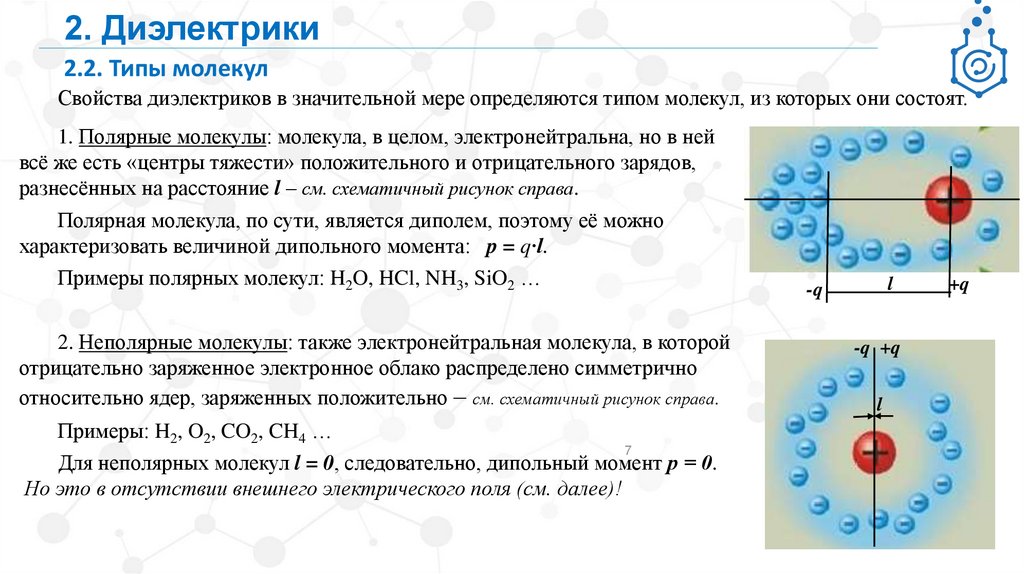1. Полярные молекулы: молекула, в целом, электронейтральна, но в ней