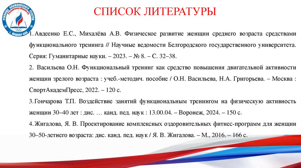 СПИСОК ЛИТЕРАТУРЫ1.Авдеенко Е.С., Михалёва А.В. Физическое развитие женщин среднего возраста средствами