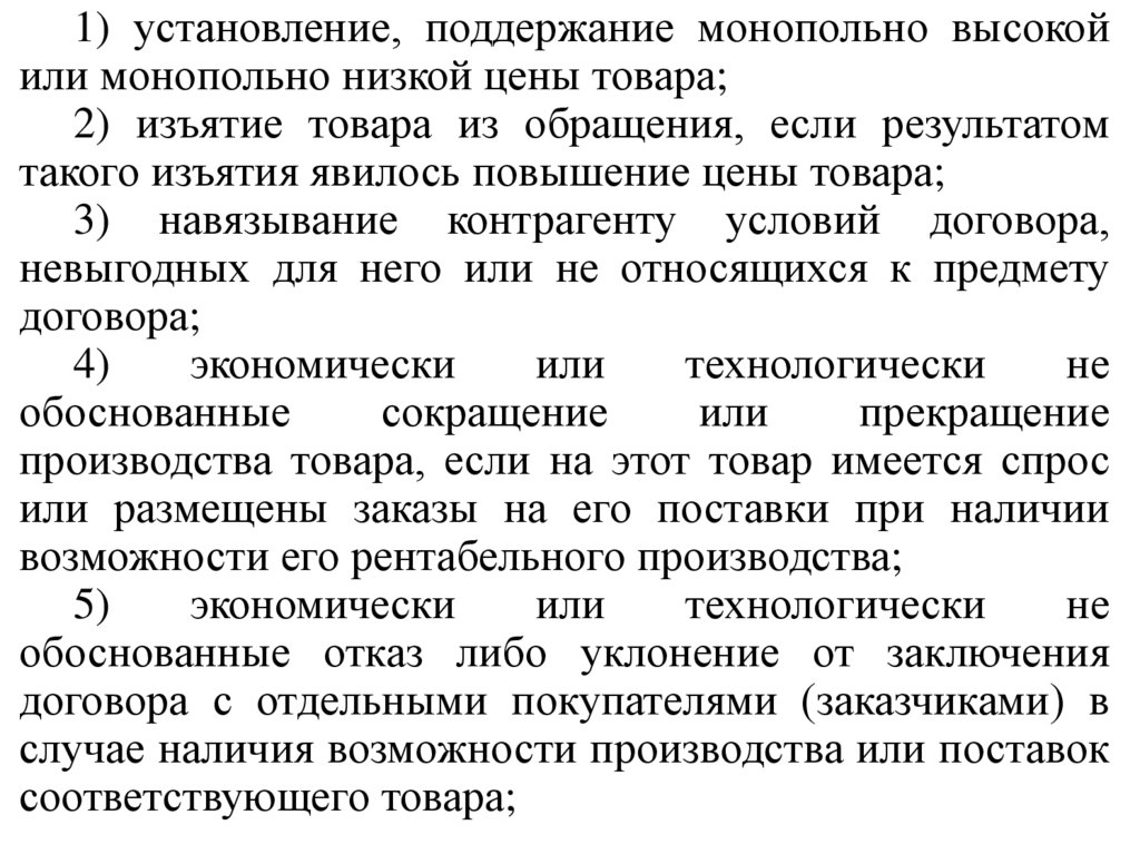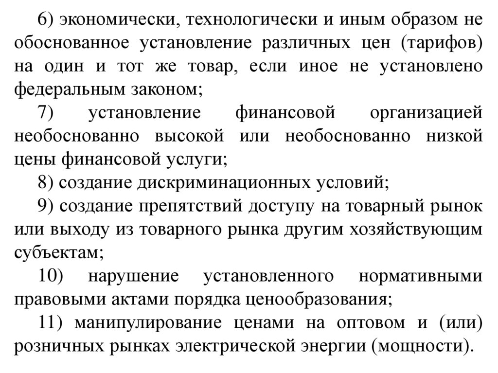 10. Правовой запрет злоупотребления доминирующим положением, сформулирован в статье 10 Закона «О защите конкуренции». Включает: -