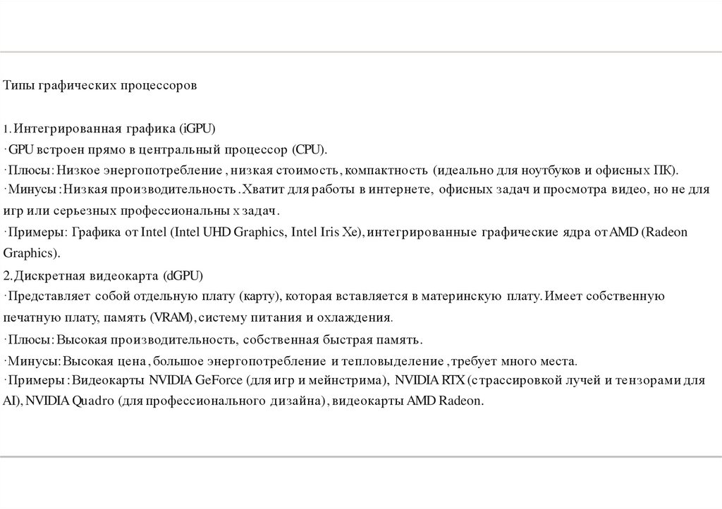 ·Примеры: Графика от Intel (Intel UHD Graphics, Intel Iris Хе), интегрированные графические ядра от AMD (Radeon