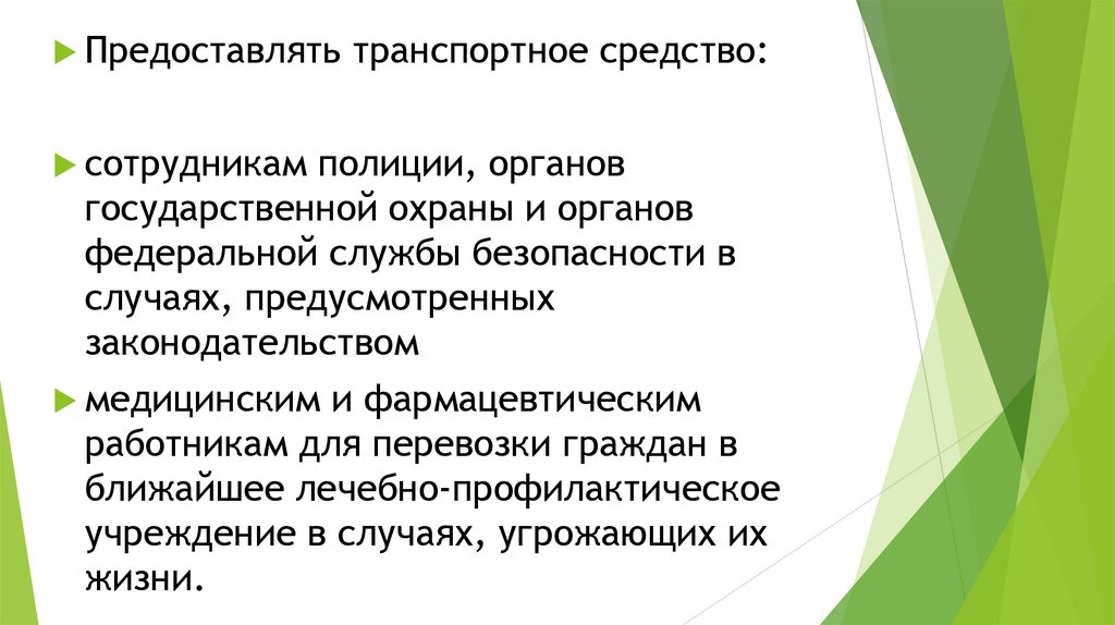 Предоставлять транспортное средство:сотрудникам полиции, органов