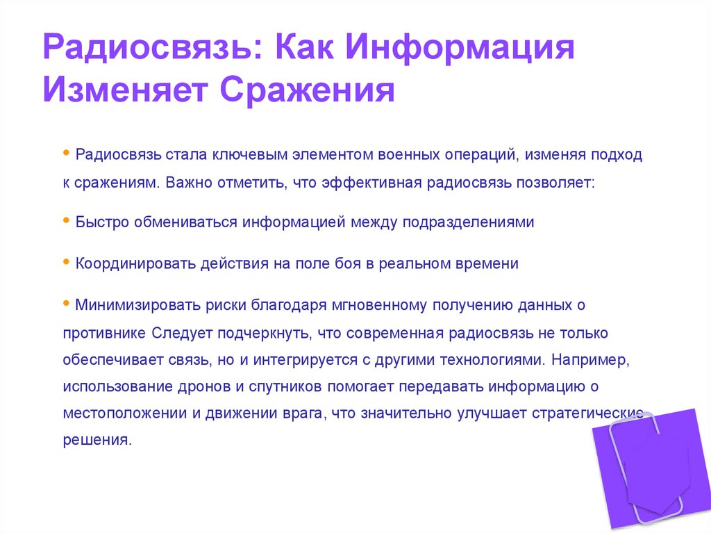 к сражениям. Важно отметить, что эффективная радиосвязь позволяет: