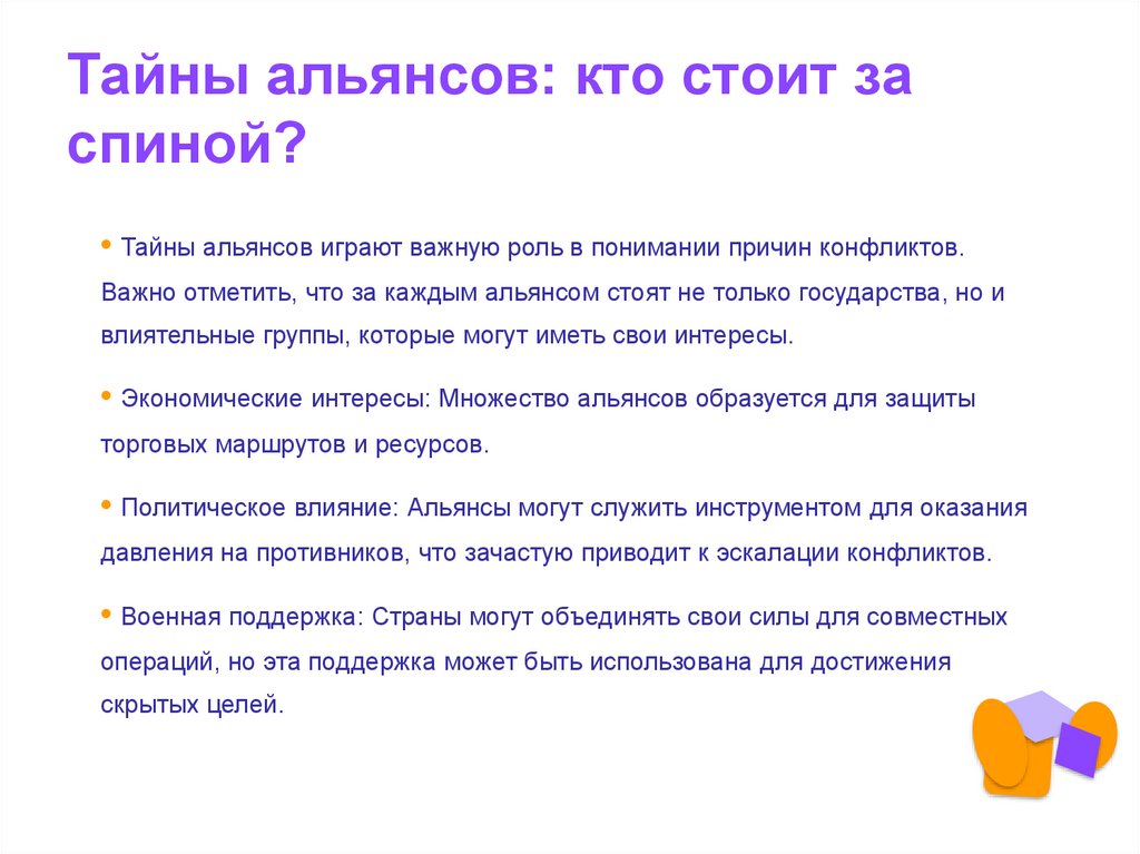 • Тайны альянсов играют важную роль в понимании причин конфликтов.