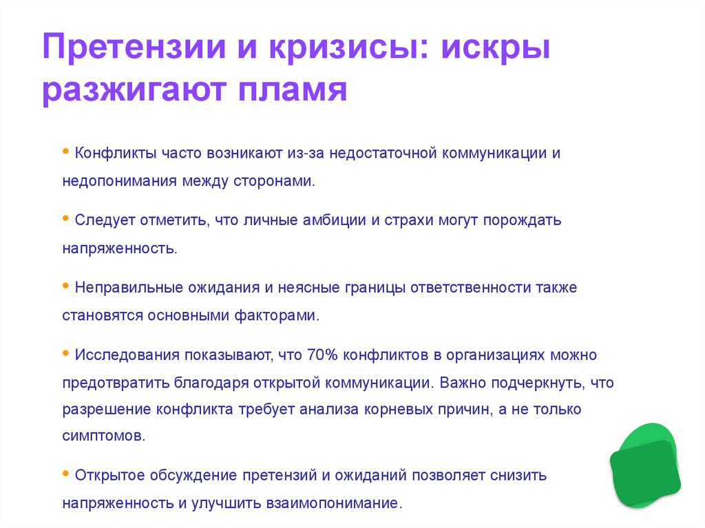 • Конфликты часто возникают из-за недостаточной коммуникации и
