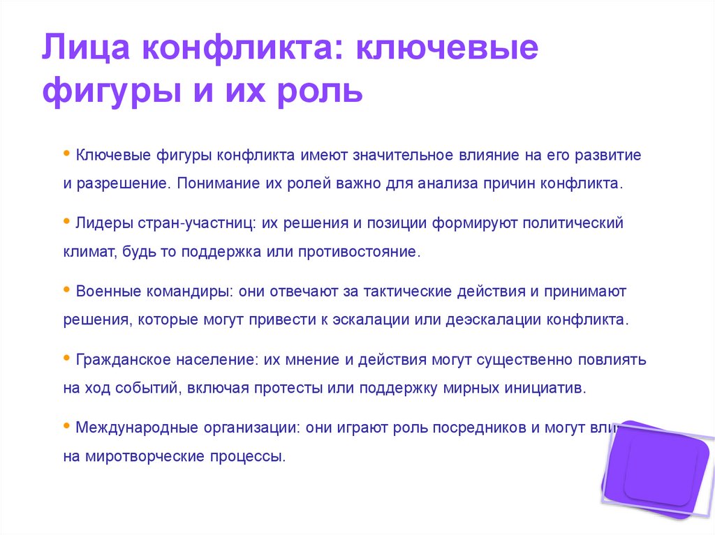 • Ключевые фигуры конфликта имеют значительное влияние на его развитие