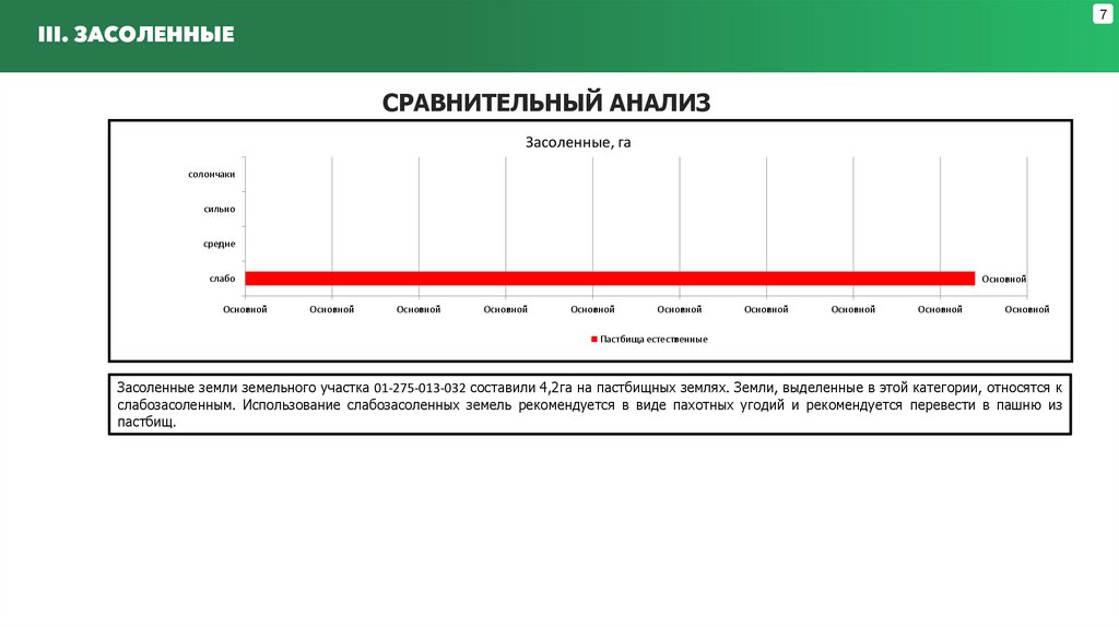 Засоленные земли земельного участка 01-275-013-032 составили 4,2га на пастбищных землях. Земли, выделенные в этой категории, относятся к