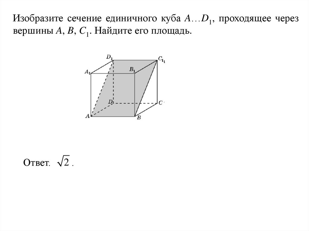 Изобразите сечение единичного куба A…D1, проходящее черезвершины A, B, C1. Найдите его площадь.