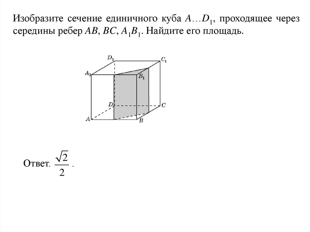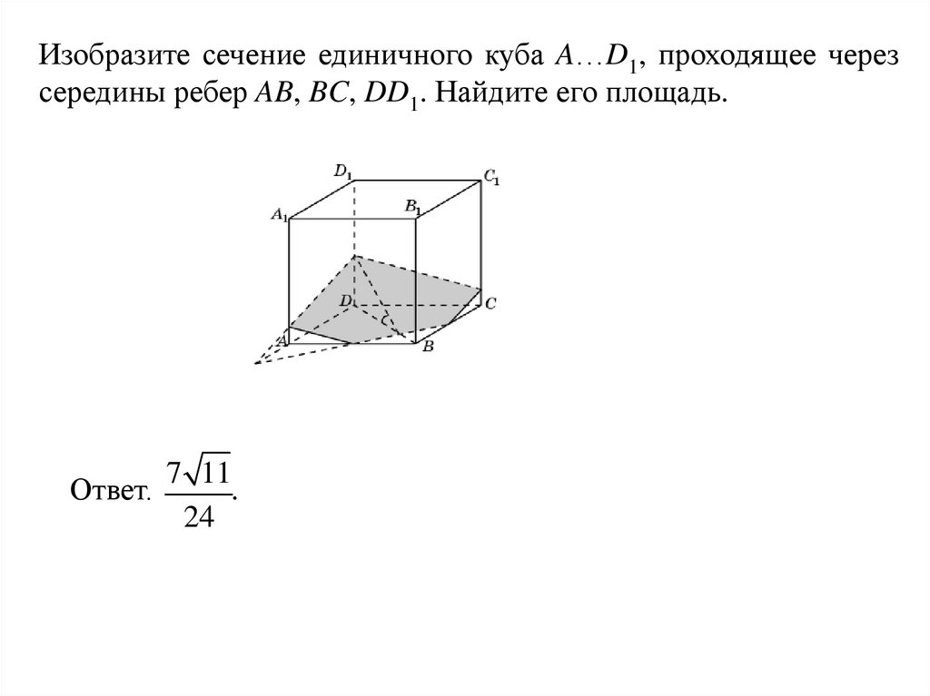 Изобразите сечение единичного куба A…D1, проходящее черезсередины ребер AB, BC, DD1. Найдите его площадь.