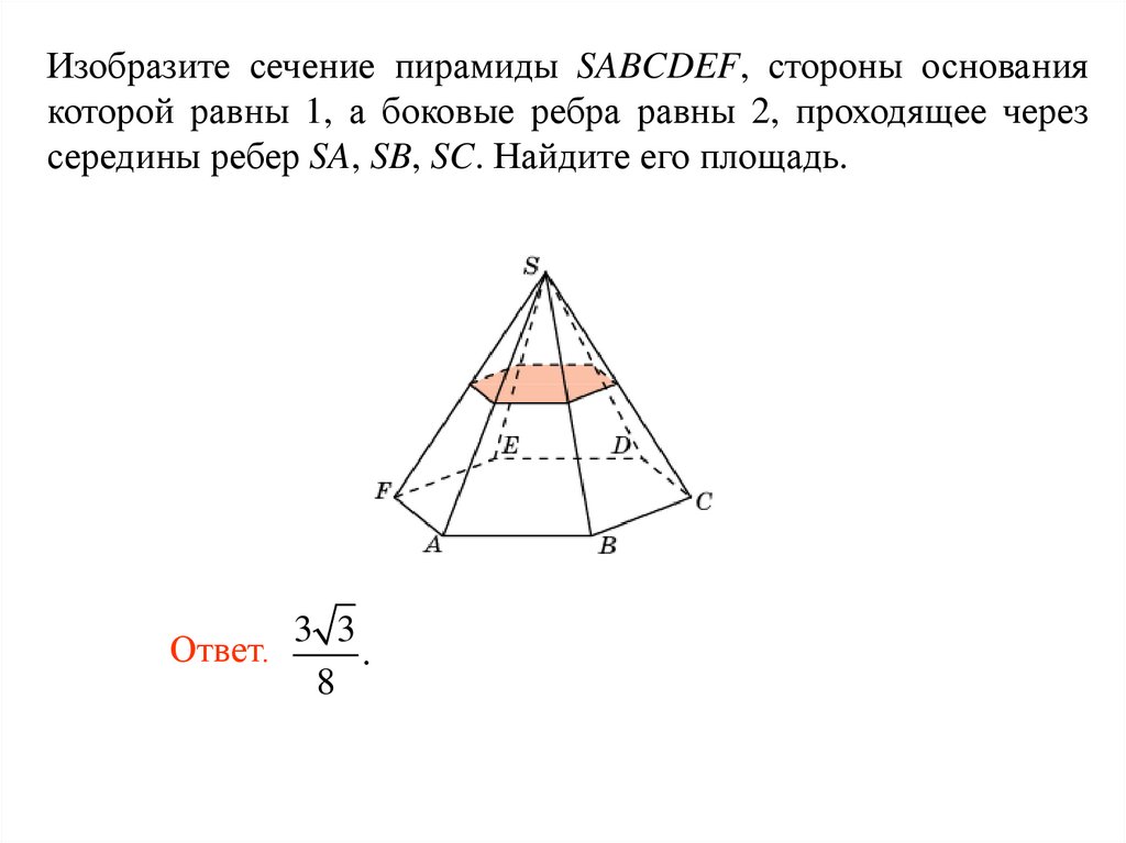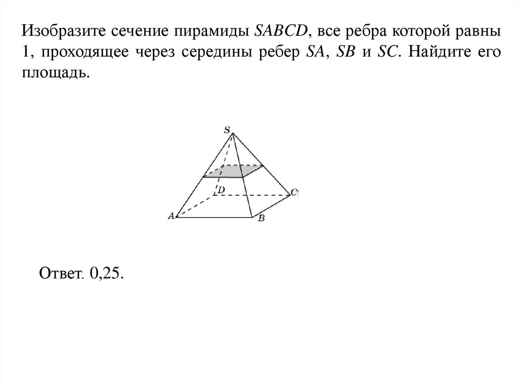 Изобразите сечение пирамиды SABCD, все ребра которой равны1, проходящее через середины ребер SA, SB и SC. Найдите его