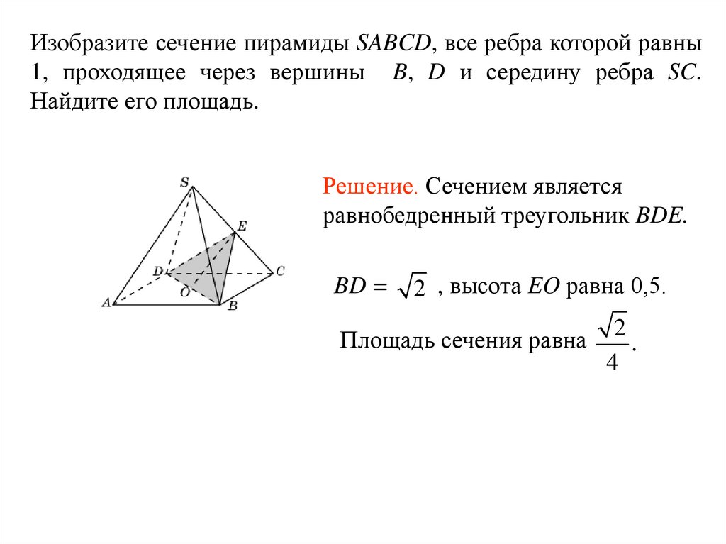 Изобразите сечение пирамиды SABCD, все ребра которой равны1, проходящее через вершины B, D и середину ребра SC.