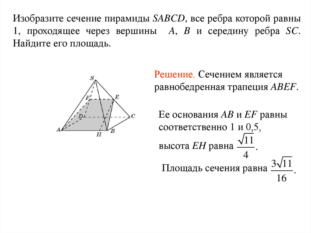 Изобразите сечение пирамиды SABCD, все ребра которой равны1, проходящее через вершины A, B и середину ребра SC.