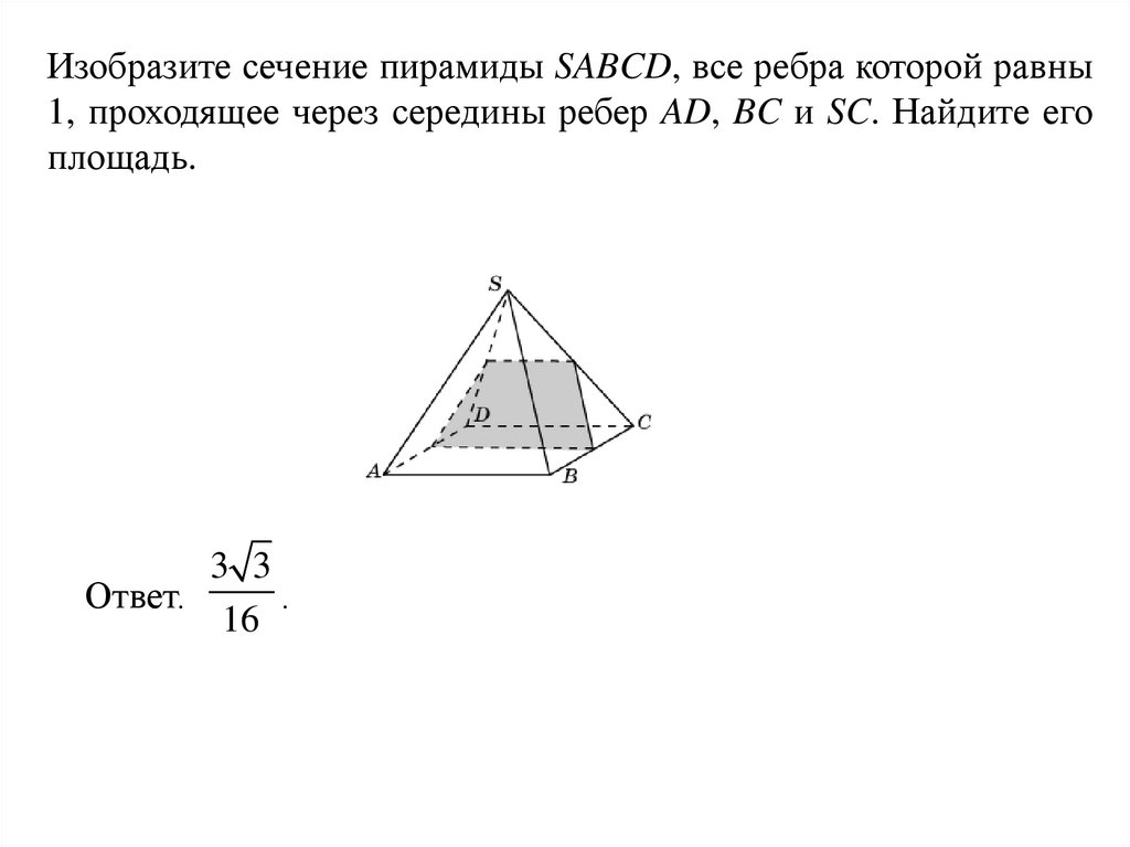 Изобразите сечение пирамиды SABCD, все ребра которой равны1, проходящее через середины ребер AD, BC и SC. Найдите его