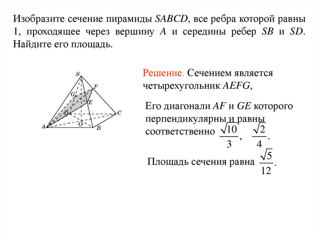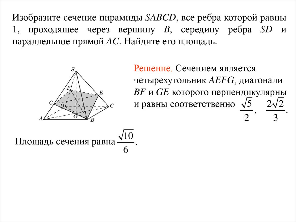 Изобразите сечение пирамиды SABCD, все ребра которой равны1, проходящее через вершину A и середины ребер SB и SD.