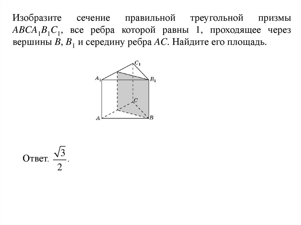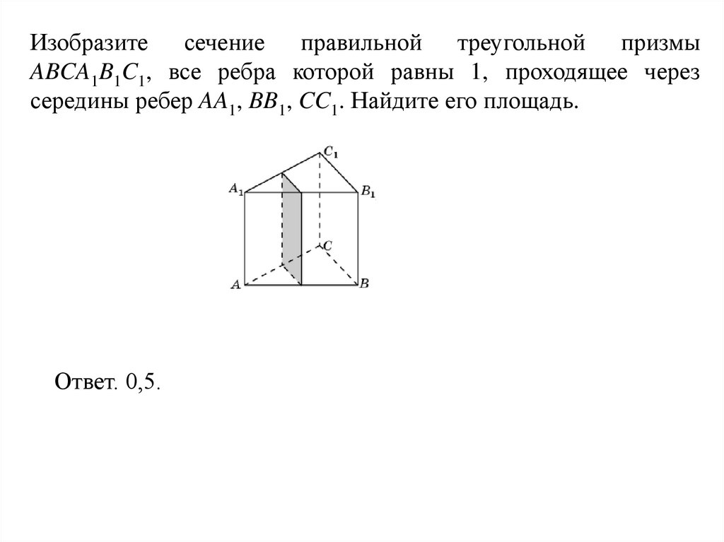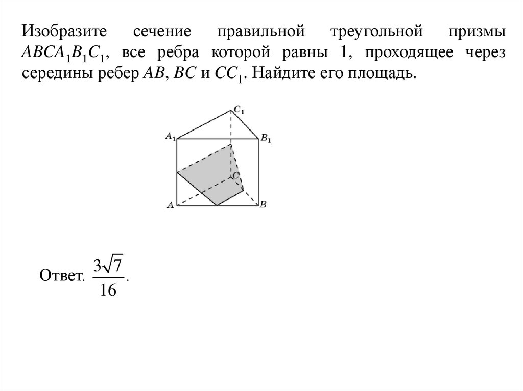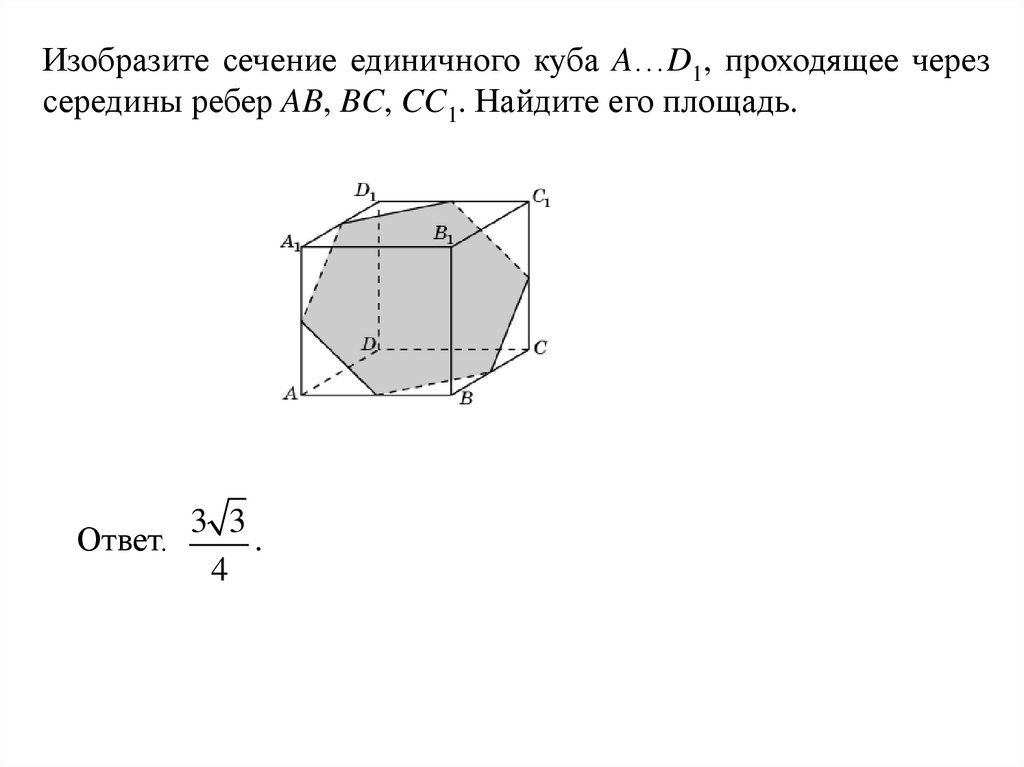 Изобразите сечение единичного куба A…D1, проходящее черезсередины ребер AB, BC, CC1. Найдите его площадь.