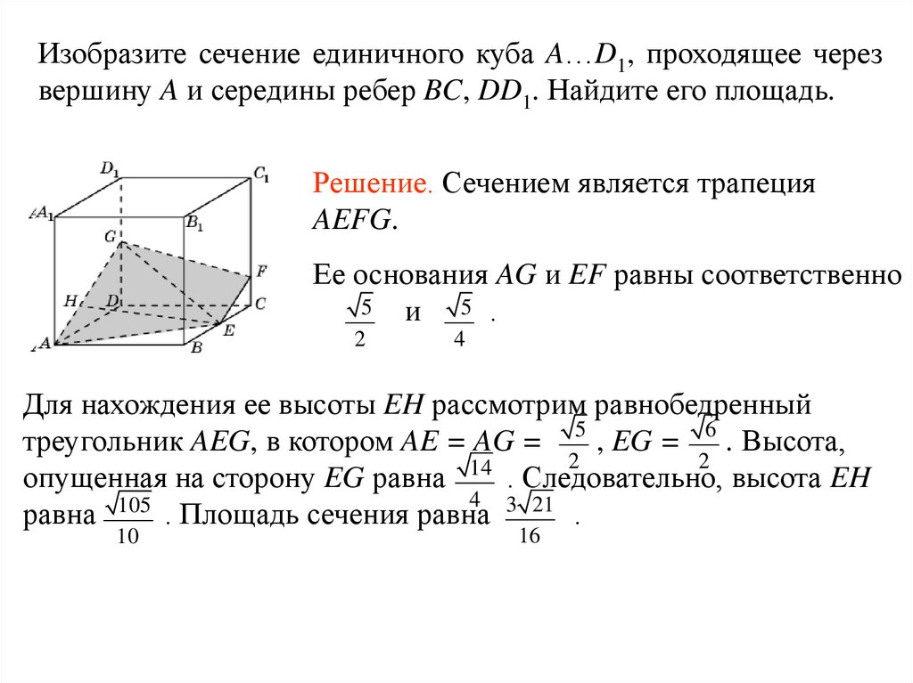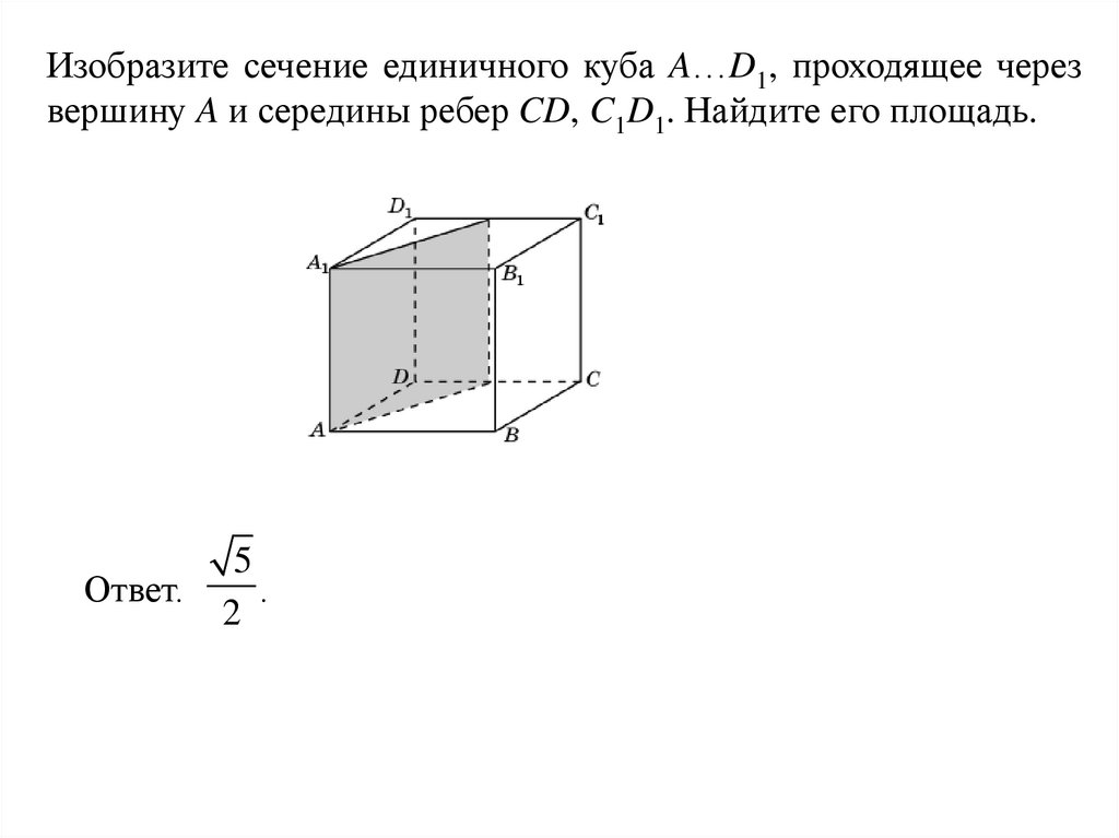 Изобразите сечение единичного куба A…D1, проходящее черезвершину A и середины ребер BC, DD1. Найдите его площадь.