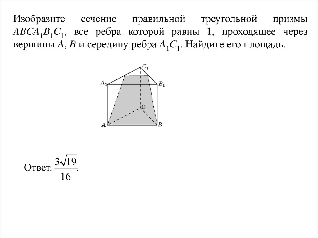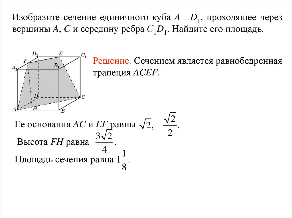 Изобразите сечение единичного куба A…D1, проходящее черезвершины A, C и середину ребра С1D1. Найдите его площадь.
