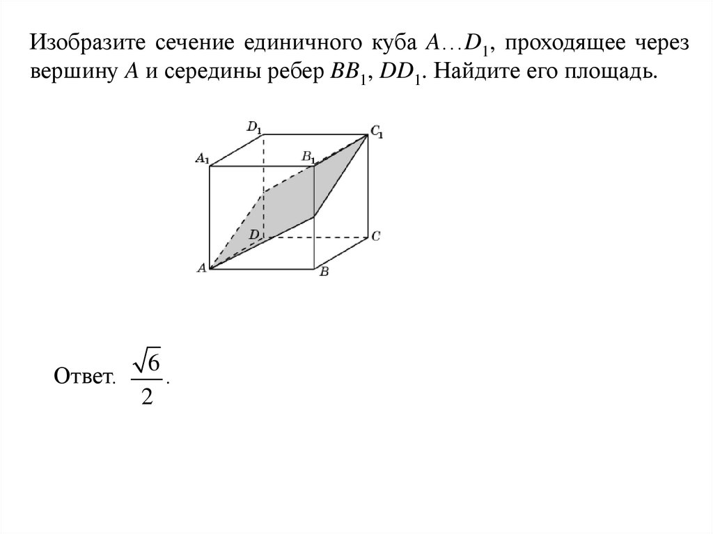 Изобразите сечение единичного куба A…D1, проходящее черезвершину A и середины ребер BB1, DD1. Найдите его площадь.