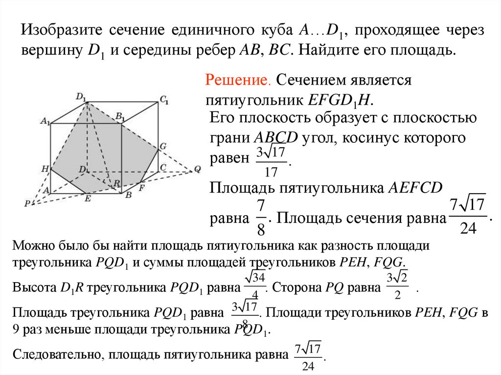 Изобразите сечение единичного куба A…D1, проходящее черезвершину D1 и середины ребер AB, BC. Найдите его площадь.