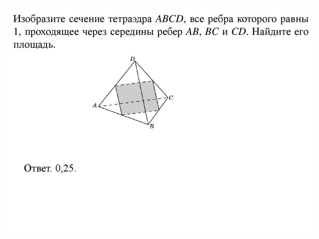 Изобразите сечение тетраэдра ABCD, все ребра которого равны1, проходящее через середины ребер AB, BC и CD. Найдите его