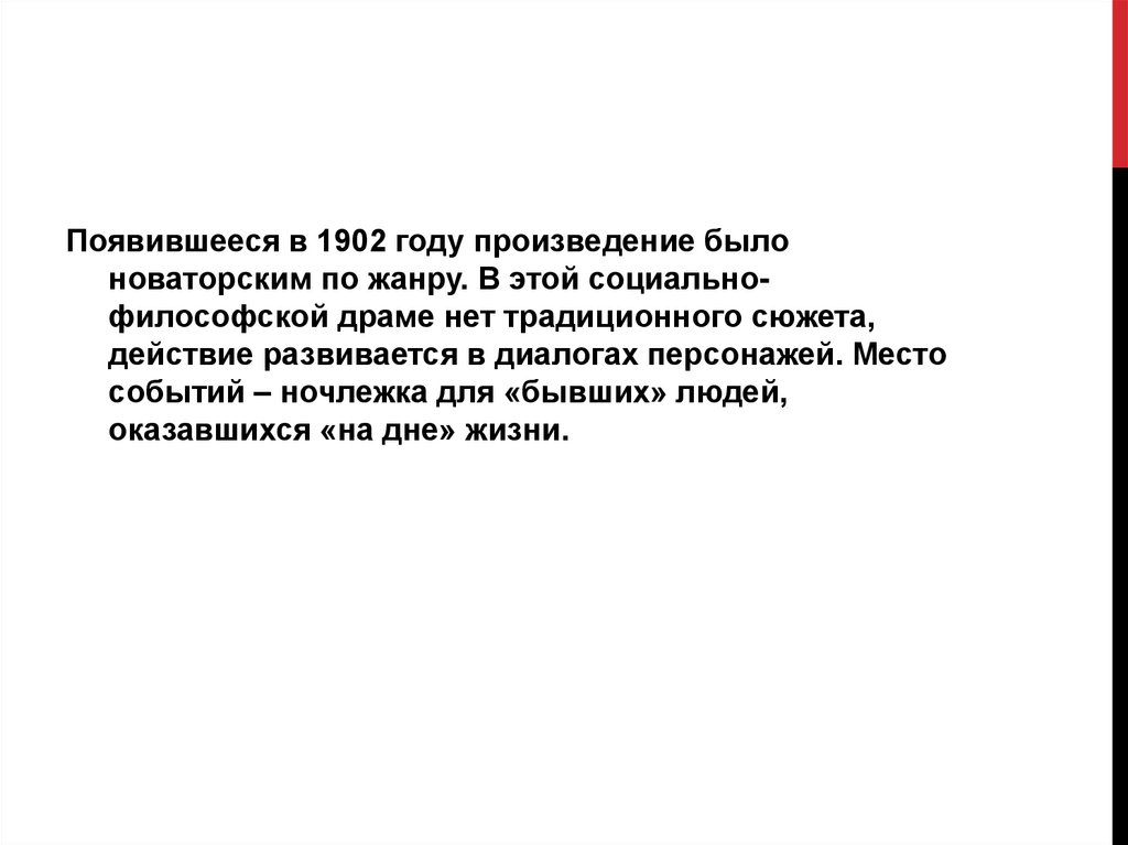 Появившееся в 1902 году произведение былоноваторским по жанру. В этой социальнофилософской драме нет традиционного сюжета,